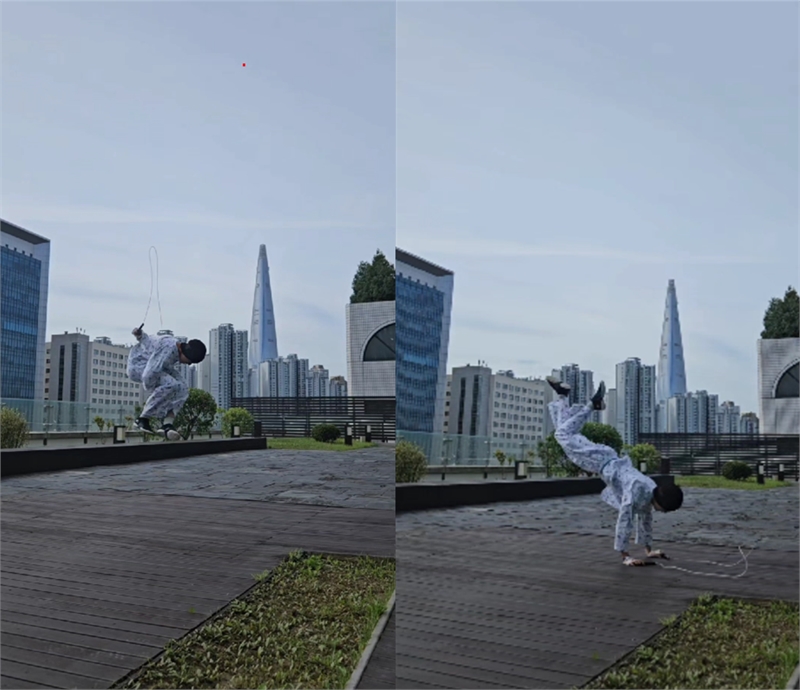 환자복을 입었지만 줄넘기 실력은 예사롭지 않다. 더블 언더를 시도하는 높은 점프력· 양팔로 바닥을 짚고 펼치는 고난도의 아크로바틱 기술도 매끄럽다. 선수 못지않은 수준급이다.