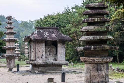 석조불감, 원형다층석탑과 절 입구에 높이 선 구층석탑은 국가유산 보물이다.