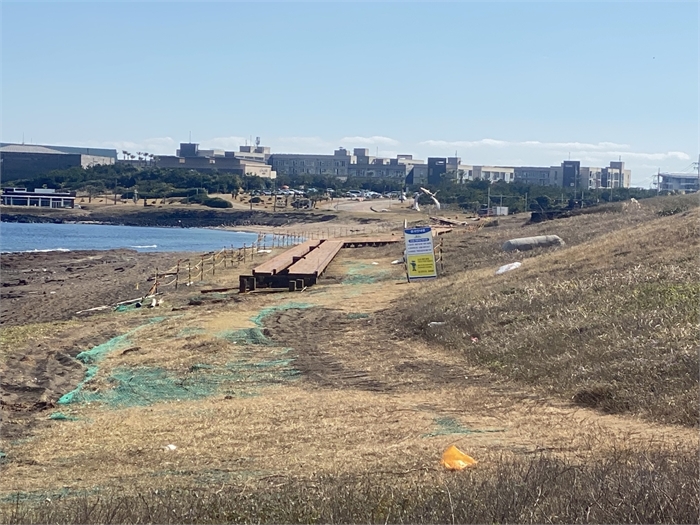 서귀포시는 '성산읍 갯벌식생 복원사업'으로 연말까지 신양 사구 내에 데크를 시설하고 있다.
