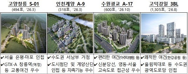 공급은 GTX와 신분당선, 올림픽대로 등 광역교통망을 이용할 수 있는 지역을 중심으로 이뤄진다. 지역별로는 경기 2만3천800가구(82.1%), 인천 3천600가구(12.4%), 서울 1천300가구(4.5%)로 경인 지역에 물량이 집중됐다.