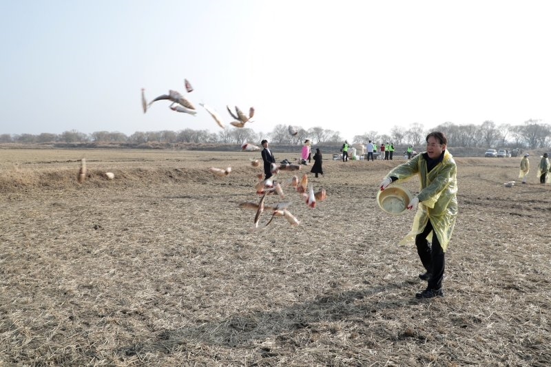 철새 먹이주기 활동에 시민단체들도 적극 나서고 있다. 주남환경학교, 한국조류보호협회 창원지회는 지난 16일 '재두루미 먹이나눔 행사'를 열었다. 주남환경학교 제공