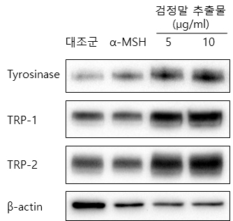 연구진은 검정말 추출물을 멜라닌 세포주(B16F10)에 처리한 결과, 멜라닌 생성에 관여하는 주요 단백질(tyrosinase, TRP-1, 2)의 발현이 증가하며 멜라닌 합성이 촉진되는 것을 확인했다.