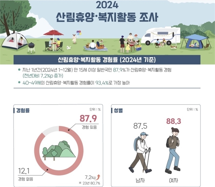 전국 5천 가구(1만 명 이상)를 대상으로 한 이번 조사에서 산림 휴양·복지활동 경험률은 무려 87.9%를 기록했다. 이는 전년(80.7%) 대비 7.2%포인트나 급증한 수치다.