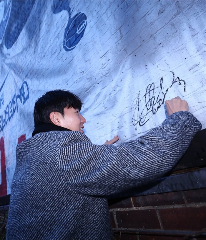 벽화에 서명을 남기는 손흥민. 토트넘 홋스퍼 SNS 캡처