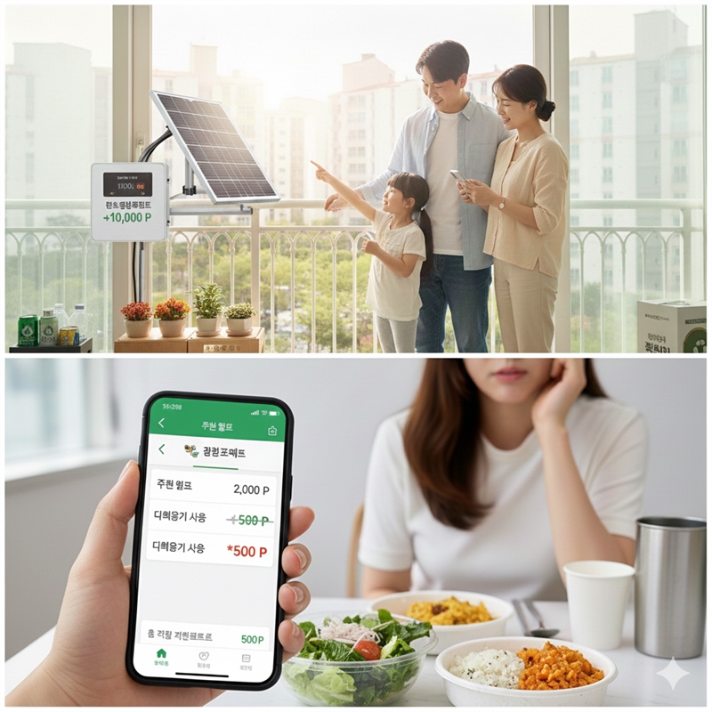 가정용 1kW 이하 베란다 태양광 발전기를 설치하면 1만 원 상당의 포인트가 지급되고, 나무 심기 캠페인 참여 시 1회 3천 원, 재생원료 제품 구매 시 건당 100원이 부여된다.