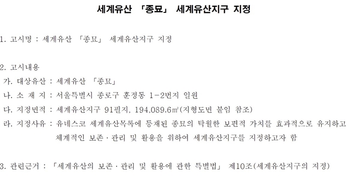 종묘 세계유산지구 지정 관보. 정부 관보 제공