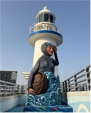 하리항 등대는 19세기 후반 제주 해녀들의 이주로 시작된 부산 해녀 역사를 반영해 해녀 모형을 설치했다.