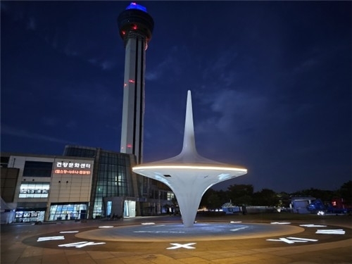 대형 팽이 조형물과 우주를 연상시키는 미디어아트가 어우러져, 밤하늘 아래에서 환상적인 장면을 연출한다.